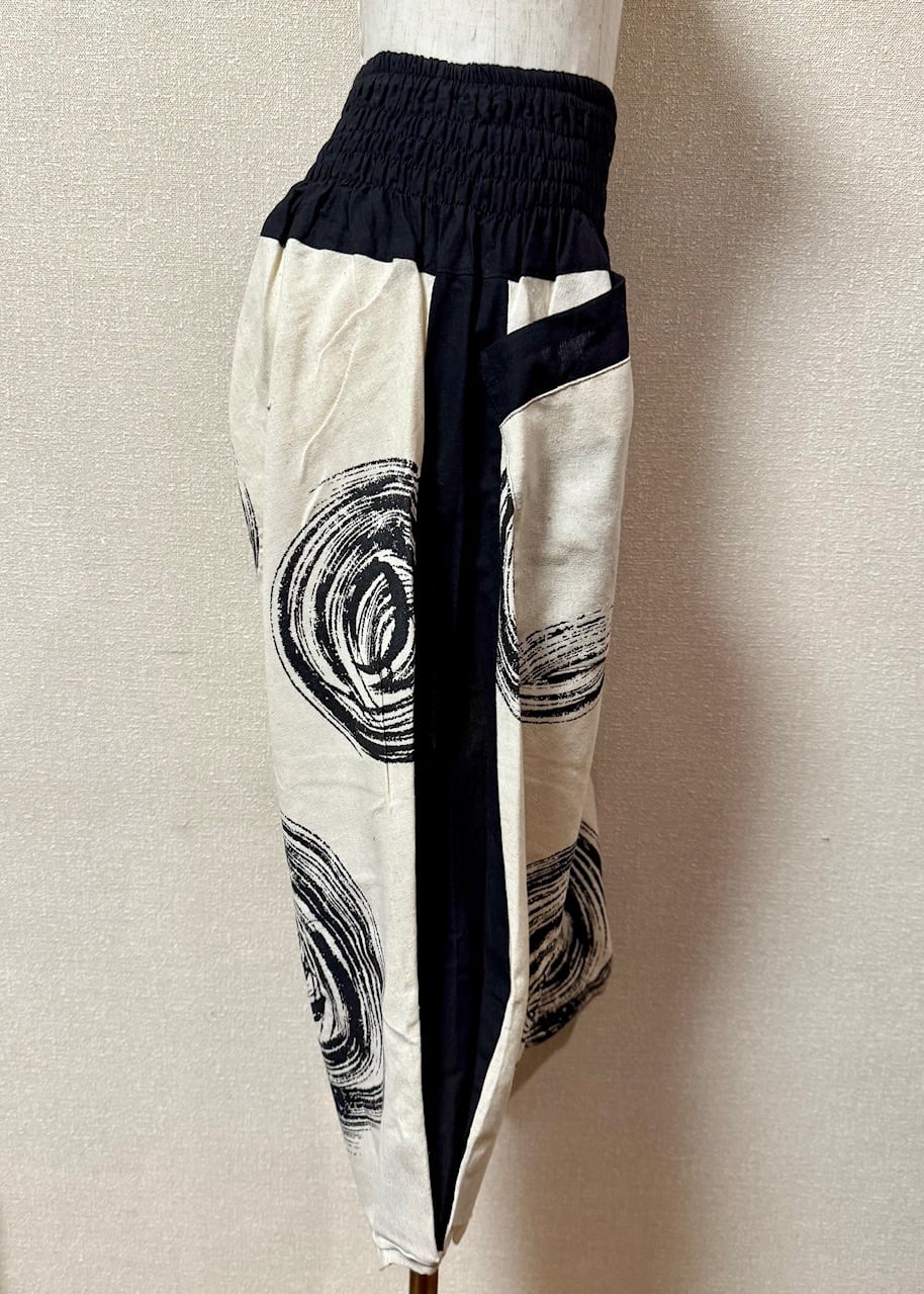 身長にもよりますが、足首が出る丈感で、ウエスト部分はゴム。 左右前面に大きめのポケットが付いてます♪