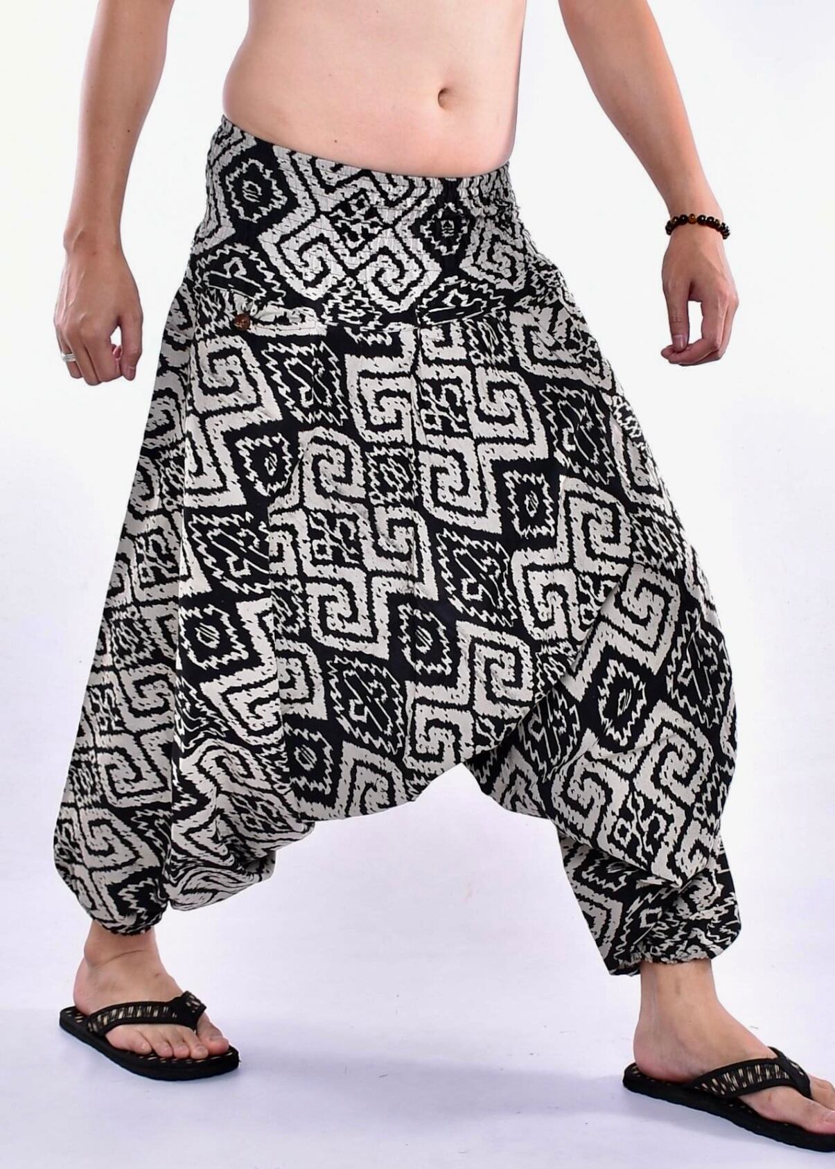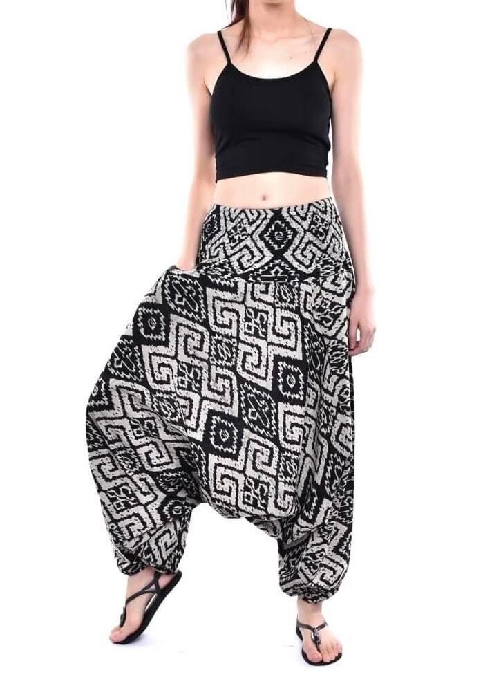 一般的な標準丈のユニセックスコットンサルエルパンツです。